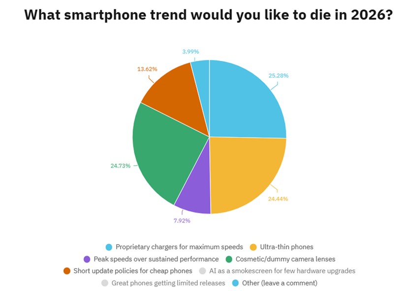 外媒Android Authority日前公布發起4,500名網友投票【哪些智慧型手機趨勢會在2026年消失?】,「AI功能成為其他硬體缺乏升級的藉口(26%)、「使用專用充電器以實現最高充電速度(17.5%)」、「裝飾性/假鏡頭相機(17.1%)」、「超薄手機(16.9%)」及「平價手機過短的更新策略(˙9.4%)」成為消費者希望在2026年消滅的前五名手機趨勢。