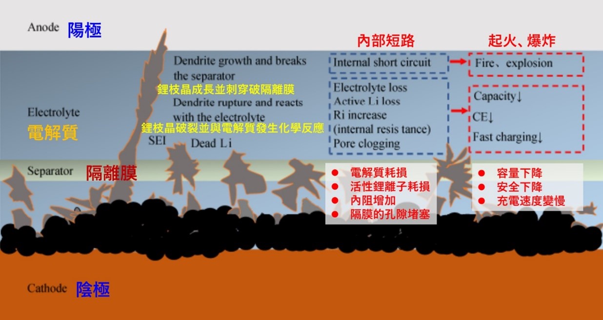 近期出現的鋰電池自燃起火事件主要都是歸因出包的電池蕊內部短路所致,傳統液態鋰電池使用一段時間後內部形成鋰枝晶(Dendrites)或金屬微粒並刺穿已變薄或受損隔離膜,導致內部短路,進而引發熱失控而起火自燃。