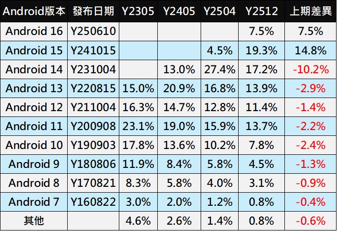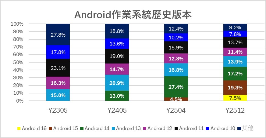 相較於Android 15發布半年只獲得4.5%佔比,Android 16半年佔比拉升到7.5%,除了Google自家Pixel手機支援外,主要原因應該是三星在2025年9月15日針對Galaxy S25 系列(S25、S25+、S25 Ultra、S25 Edg )及2025年10月針對Galaxy S24 系列(S24、S24+、S24 Ultra)用戶推送基於 Android 16 的穩定版 One UI 8有關。