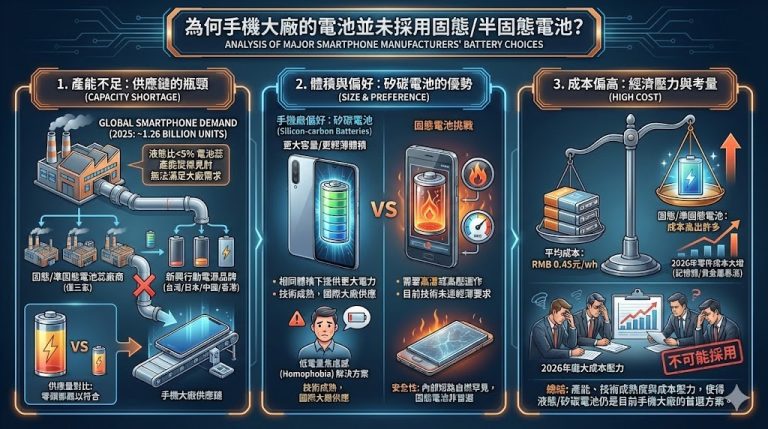 各手機大廠目前沒有採用【固態/準固態/半固態電池】取代手機傳統液態電池的原因,主要如下: