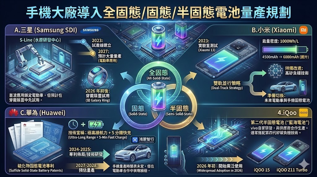 雖然目前手機大廠都尚未在手機採用【固態/準固態電池】,基於全固態電池(All-Solid-State Battery)已是全球科技巨頭與手機大廠相互競逐的下一代電池主要賽道,目前已知三星(Samsung SDI)、華為 (Huawei)、小米 (Xiaomi) 都有將固態電池在2027年量產導入手機或其他裝置的計畫,摘要如下: