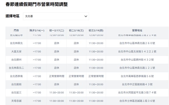 2月16日除夕,直營門市提早至10點30分開門,加盟門市開店時間不變,但直營與加盟門市的打烊時間皆提前至下午4點30分:初一至初三(2/17~2/19),部分直營/加盟門市休息,其餘直營門市則依店別分為中午12點至晚上8點30分,以及11點30分至晚上8點兩個營業時間;加盟門市營業時間則為12點至晚上6點。初四(2/20)全台直營與加盟門市均恢復正常營業時間。詳細門市營業資訊可上台灣大官網或手機直撥188、客服專線0809-000-852查詢。