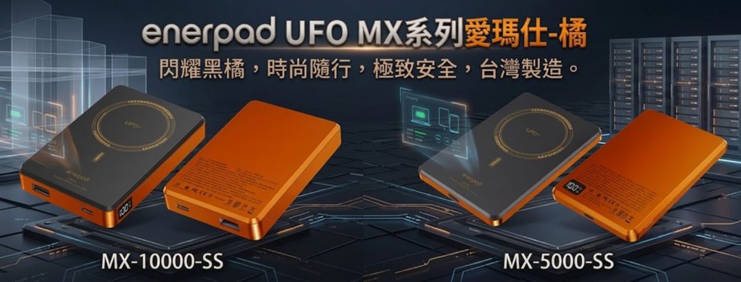 iPhone 17 Pro系列推出新色「宇宙橙色」與「藏藍色」,成為果粉首選。根據中華電信首賣數據,iPhone 17 Pro系列「宇宙橙」在特定通路銷售占比高達近4成,掀起3C產品的橘海風潮。為了響應這股橘色風暴,enerpad「UFO輕薄時尚MX系列 」推出限量的【愛瑪仕-橘】新色。MX-5000-SS訴求「耀眼黑橘,輕薄隨行」, MX-10000-SS則訴求「光彩黑橘,能量隨行」。