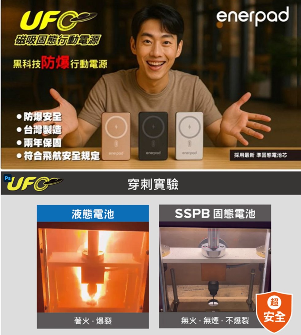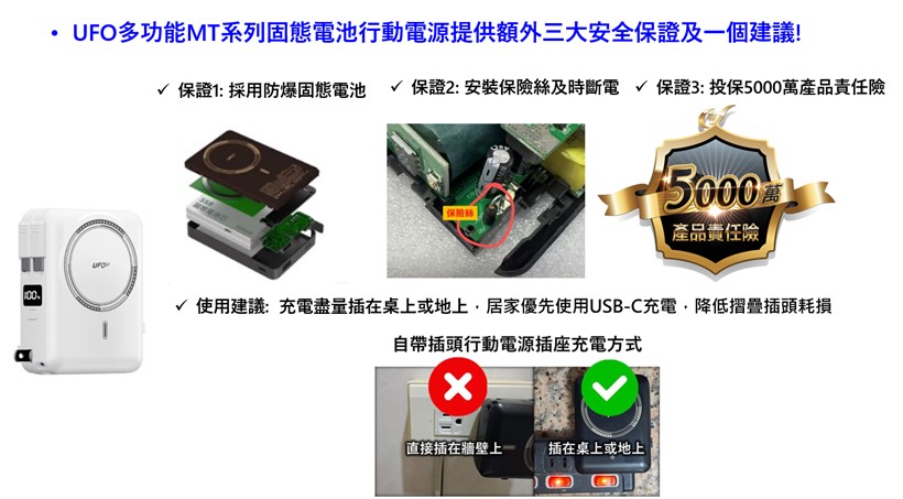 以標榜極致安全的enerPad UFO MT系列固態電池行動電源為例,採用可以最大限度避免內部短路的固態電池、內部裝置有保險絲可即時斷電、最大輸入/輸入限制在18W/20W避免充放電過熱、通過台灣BSMI/NCC認證及符合CCC安規、台灣製作並投保5000萬產品責任險。只要民眾盡量避免將自帶插頭的行動電源直插牆壁規避不慎碰撞造成插頭鬆動,通常可以放心使用。