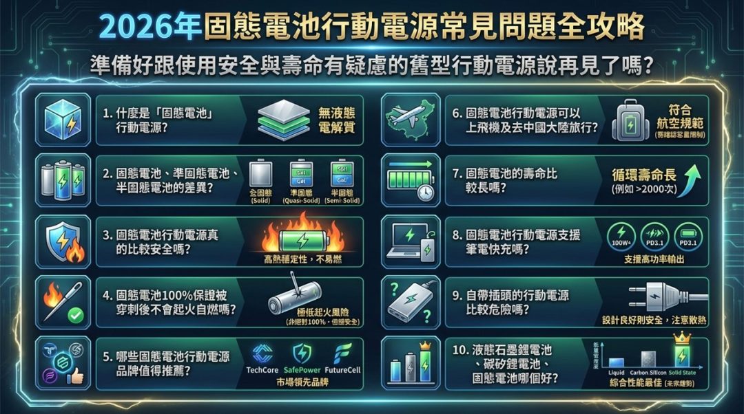 準備好跟使用安全與壽命有疑慮的舊型行動電源說再見了嗎?以下整理了最新最完整的固態電池行動電源選購與常見問題(FAQ):