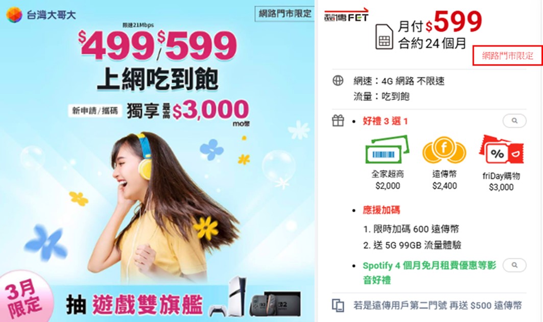 以最新2026/03來看,兩家業者網路門市的4G 599(24)單門號案都享有$3000的電信幣,若將電信幣用來繳電信帳單或是購物,扣除電信幣優惠,平均每月支付金額仍是低於$499。不過,4G 599不降速吃到飽專案只限網路門市申辦且限新辦或攜碼,通常無法續約。