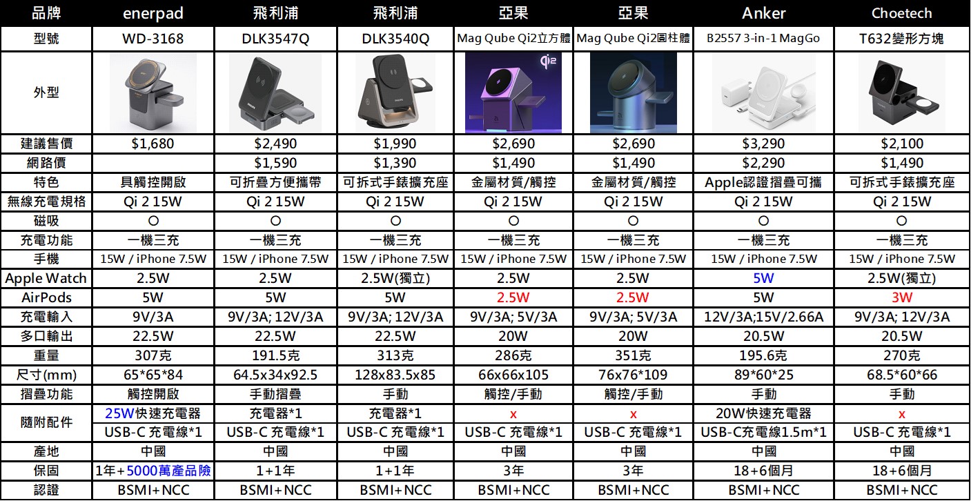 目前坊間「Apple三合一桌上型磁吸無線充電器」最新網路促銷價售價$1xxx~$2290不等,不過各品牌樣式與支援無線充電規格不盡相同,不少售價較低的機型隨機並搭贈大功率的PD旅充,要特別留意,以免失算!