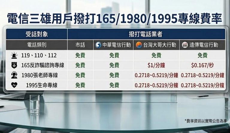 根據警政署資料顯示,2025年165專線接通量達47.5萬通,較2023年增加9%;根據NCC資料,2025年中華電信向遠傳收取165專線接續費約9.6萬元、向台灣大哥大收取約9.3萬元;但若以遠傳用戶全年撥打165專線總通話約68.8萬分鐘、台灣大哥大用戶約99.1萬分鐘估算,兩家業者向用戶收取的總通話費分別約68.8萬元與99.1萬元,由此顯示民眾對反詐求助需求持續上升,也更凸顯免費的必要性。