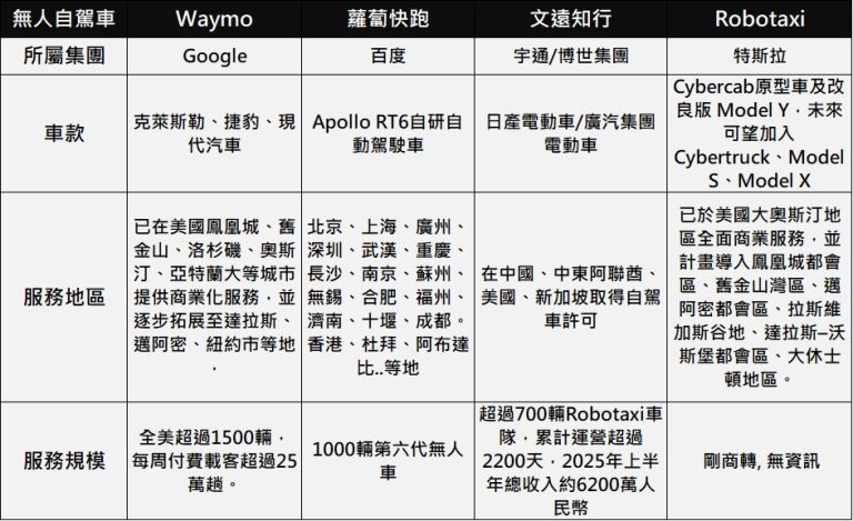 日前有美國民眾在美國奧斯汀街頭看到特斯Model Y行駛的畫面,車內似乎空無一人,甚至沒有安全監督員。馬斯克證實表示除掉安全員的Robotaxi正在測試中,年底前將開放搭乘!全球科技巨頭(Google、Tesla、百度、亞馬遜..)及叫車平台(Uber 、 Lyft ..)皆如火如荼爭奪無人駕駛計程車市場。 全球無人計程車發展最新進成為何呢? 以下做一整理與說明: 圖片來源: Threads…
